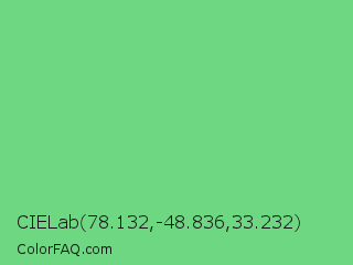 CIELab 78.132,-48.836,33.232 Color is a light green color and the nearest color is Pastel Green #77dd77. Hex code #6dd781 and RGB value is rgb(109,215,129). In RGB color space, this color is composed of 43% red, 84% green, 51% blue, In CMYK color space, this color is composed of 49% cyan, 0% magenta, 40% yellow , 16% black , In HSL color space, this color has a hue angle of 131° , 57% saturation and 64% lightness.
