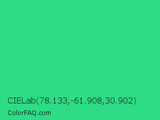 CIELab 78.133,-61.908,30.902 Color is a normal green color and the nearest color is Shamrock #33cc99. Hex code #2ddc85 and RGB value is rgb(45,220,133). In RGB color space, this color is composed of 18% red, 86% green, 52% blue, In CMYK color space, this color is composed of 80% cyan, 0% magenta, 40% yellow , 14% black , In HSL color space, this color has a hue angle of 150° , 71% saturation and 52% lightness.