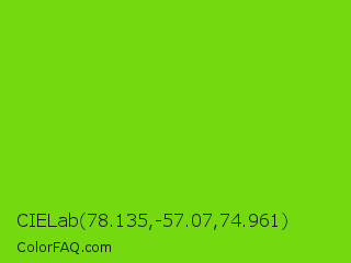 CIELab 78.135,-57.07,74.961 Color is a normal green color and the nearest color is Alien Armpit #84de02. Hex code #75d90f and RGB value is rgb(117,217,15). In RGB color space, this color is composed of 46% red, 85% green, 6% blue, In CMYK color space, this color is composed of 46% cyan, 0% magenta, 93% yellow , 15% black , In HSL color space, this color has a hue angle of 90° , 87% saturation and 45% lightness.