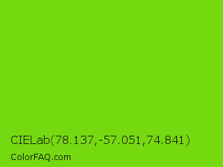 CIELab 78.137,-57.051,74.841 Color is a normal green color and the nearest color is Alien Armpit #84de02. Hex code #75d910 and RGB value is rgb(117,217,16). In RGB color space, this color is composed of 46% red, 85% green, 6% blue, In CMYK color space, this color is composed of 46% cyan, 0% magenta, 93% yellow , 15% black , In HSL color space, this color has a hue angle of 90° , 86% saturation and 46% lightness.