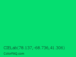 CIELab 78.137,-68.736,41.306 Color is a normal green color and the nearest color is Malachite #0bda51. Hex code #05de70 and RGB value is rgb(5,222,112). In RGB color space, this color is composed of 2% red, 87% green, 44% blue, In CMYK color space, this color is composed of 98% cyan, 0% magenta, 50% yellow , 13% black , In HSL color space, this color has a hue angle of 150° , 96% saturation and 45% lightness.