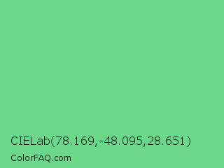 CIELab 78.169,-48.095,28.651 Color is a light green color and the nearest color is Very Light Malachite Green #64e986. Hex code #6ad78a and RGB value is rgb(106,215,138). In RGB color space, this color is composed of 42% red, 84% green, 54% blue, In CMYK color space, this color is composed of 51% cyan, 0% magenta, 36% yellow , 16% black , In HSL color space, this color has a hue angle of 138° , 58% saturation and 63% lightness.