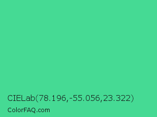CIELab 78.196,-55.056,23.322 Color is a normal green color and the nearest color is Eucalyptus #44d7a8. Hex code #45da94 and RGB value is rgb(69,218,148). In RGB color space, this color is composed of 27% red, 85% green, 58% blue, In CMYK color space, this color is composed of 68% cyan, 0% magenta, 32% yellow , 15% black , In HSL color space, this color has a hue angle of 152° , 67% saturation and 56% lightness.