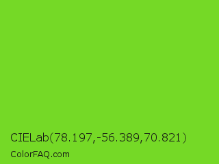 CIELab 78.197,-56.389,70.821 Color is a normal green color and the nearest color is Lima #76bd17. Hex code #75d926 and RGB value is rgb(117,217,38). In RGB color space, this color is composed of 46% red, 85% green, 15% blue, In CMYK color space, this color is composed of 46% cyan, 0% magenta, 82% yellow , 15% black , In HSL color space, this color has a hue angle of 94° , 70% saturation and 50% lightness.