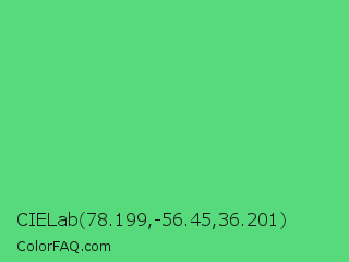 CIELab 78.199,-56.45,36.201 Color is a normal green color and the nearest color is Emerald #50c878. Hex code #56da7b and RGB value is rgb(86,218,123). In RGB color space, this color is composed of 34% red, 85% green, 48% blue, In CMYK color space, this color is composed of 61% cyan, 0% magenta, 44% yellow , 15% black , In HSL color space, this color has a hue angle of 137° , 64% saturation and 60% lightness.