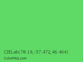 CIELab 78.19,-57.472,46.464 Color is a light green color and the nearest color is Emerald #50c878. Hex code #5fda66 and RGB value is rgb(95,218,102). In RGB color space, this color is composed of 37% red, 85% green, 40% blue, In CMYK color space, this color is composed of 56% cyan, 0% magenta, 53% yellow , 15% black , In HSL color space, this color has a hue angle of 123° , 62% saturation and 61% lightness.