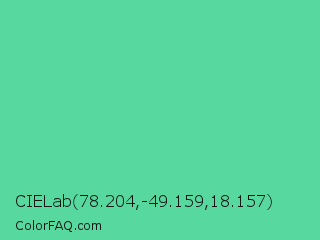 CIELab 78.204,-49.159,18.157 Color is a normal green color and the nearest color is Medium Aquamarine #66ddaa. Hex code #56d89e and RGB value is rgb(86,216,158). In RGB color space, this color is composed of 34% red, 85% green, 62% blue, In CMYK color space, this color is composed of 60% cyan, 0% magenta, 27% yellow , 15% black , In HSL color space, this color has a hue angle of 153° , 63% saturation and 59% lightness.