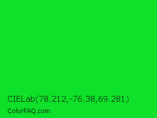 CIELab 78.212,-76.38,69.281 Color is a normal green color and the nearest color is Vivid Malachite #00cc33. Hex code #0fe029 and RGB value is rgb(15,224,41). In RGB color space, this color is composed of 6% red, 88% green, 16% blue, In CMYK color space, this color is composed of 93% cyan, 0% magenta, 82% yellow , 12% black , In HSL color space, this color has a hue angle of 127° , 87% saturation and 47% lightness.