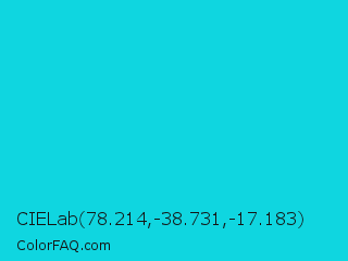 CIELab 78.214,-38.731,-17.183 Color is a normal cyan color and the nearest color is Bright Turquoise #08e8de. Hex code #0fd6e0 and RGB value is rgb(15,214,224). In RGB color space, this color is composed of 6% red, 84% green, 88% blue, In CMYK color space, this color is composed of 93% cyan, 4% magenta, 0% yellow , 12% black , In HSL color space, this color has a hue angle of 183° , 87% saturation and 47% lightness.