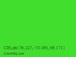 CIELab 78.227,-70.081,68.171 Color is a normal green color and the nearest color is Lime Green #32cd32. Hex code #42de2e and RGB value is rgb(66,222,46). In RGB color space, this color is composed of 26% red, 87% green, 18% blue, In CMYK color space, this color is composed of 70% cyan, 0% magenta, 79% yellow , 13% black , In HSL color space, this color has a hue angle of 113° , 73% saturation and 53% lightness.