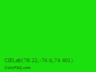 CIELab 78.22,-76.6,74.401 Color is a normal green color and the nearest color is Neon Green #39ff14. Hex code #1ce00d and RGB value is rgb(28,224,13). In RGB color space, this color is composed of 11% red, 88% green, 5% blue, In CMYK color space, this color is composed of 88% cyan, 0% magenta, 94% yellow , 12% black , In HSL color space, this color has a hue angle of 116° , 89% saturation and 46% lightness.