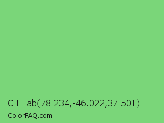 CIELab 78.234,-46.022,37.501 Color is a light green color and the nearest color is Pastel Green #77dd77. Hex code #7ad679 and RGB value is rgb(122,214,121). In RGB color space, this color is composed of 48% red, 84% green, 47% blue, In CMYK color space, this color is composed of 43% cyan, 0% magenta, 43% yellow , 16% black , In HSL color space, this color has a hue angle of 119° , 53% saturation and 66% lightness.