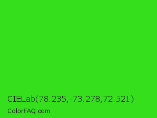 CIELab 78.235,-73.278,72.521 Color is a normal green color and the nearest color is Harlequin Green #46cb18. Hex code #35df1b and RGB value is rgb(53,223,27). In RGB color space, this color is composed of 21% red, 87% green, 11% blue, In CMYK color space, this color is composed of 76% cyan, 0% magenta, 88% yellow , 13% black , In HSL color space, this color has a hue angle of 112° , 78% saturation and 49% lightness.