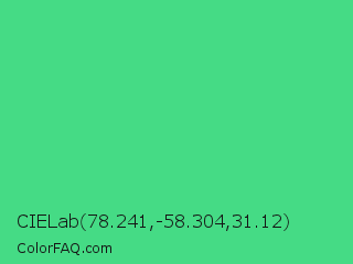 CIELab 78.241,-58.304,31.12 Color is a normal green color and the nearest color is UFO Green #3cd070. Hex code #45db85 and RGB value is rgb(69,219,133). In RGB color space, this color is composed of 27% red, 86% green, 52% blue, In CMYK color space, this color is composed of 68% cyan, 0% magenta, 39% yellow , 14% black , In HSL color space, this color has a hue angle of 146° , 68% saturation and 56% lightness.
