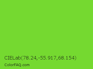 CIELab 78.24,-55.917,68.154 Color is a normal green color and the nearest color is Kiwi #8ee53f. Hex code #75d930 and RGB value is rgb(117,217,48). In RGB color space, this color is composed of 46% red, 85% green, 19% blue, In CMYK color space, this color is composed of 46% cyan, 0% magenta, 78% yellow , 15% black , In HSL color space, this color has a hue angle of 96° , 69% saturation and 52% lightness.