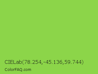 CIELab 78.254,-45.136,59.744 Color is a normal green color and the nearest color is Kiwi #8ee53f. Hex code #8cd549 and RGB value is rgb(140,213,73). In RGB color space, this color is composed of 55% red, 84% green, 29% blue, In CMYK color space, this color is composed of 34% cyan, 0% magenta, 66% yellow , 16% black , In HSL color space, this color has a hue angle of 91° , 63% saturation and 56% lightness.