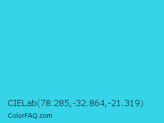CIELab 78.285,-32.864,-21.319 Color is a normal cyan color and the nearest color is Turquoise #40e0d0. Hex code #36d4e8 and RGB value is rgb(54,212,232). In RGB color space, this color is composed of 21% red, 83% green, 91% blue, In CMYK color space, this color is composed of 77% cyan, 9% magenta, 0% yellow , 9% black , In HSL color space, this color has a hue angle of 187° , 79% saturation and 56% lightness.