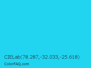 CIELab 78.287,-32.033,-25.618 Color is a normal cyan color and the nearest color is Spiro Disco Ball #0fc0fc. Hex code #21d4f0 and RGB value is rgb(33,212,240). In RGB color space, this color is composed of 13% red, 83% green, 94% blue, In CMYK color space, this color is composed of 86% cyan, 12% magenta, 0% yellow , 6% black , In HSL color space, this color has a hue angle of 188° , 87% saturation and 54% lightness.