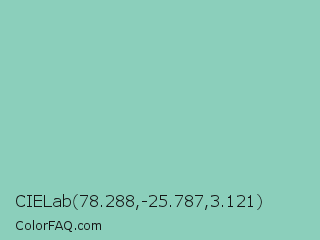CIELab 78.288,-25.787,3.121 Color is a light green color and the nearest color is Vista Blue #8fd6b4. Hex code #8bcfbb and RGB value is rgb(139,207,187). In RGB color space, this color is composed of 55% red, 81% green, 73% blue, In CMYK color space, this color is composed of 33% cyan, 0% magenta, 10% yellow , 19% black , In HSL color space, this color has a hue angle of 162° , 41% saturation and 68% lightness.