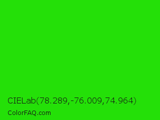 CIELab 78.289,-76.009,74.964 Color is a normal green color and the nearest color is Neon Green #39ff14. Hex code #24e008 and RGB value is rgb(36,224,8). In RGB color space, this color is composed of 14% red, 88% green, 3% blue, In CMYK color space, this color is composed of 84% cyan, 0% magenta, 96% yellow , 12% black , In HSL color space, this color has a hue angle of 112° , 93% saturation and 45% lightness.
