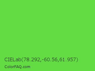 CIELab 78.292,-60.56,61.957 Color is a normal green color and the nearest color is Kiwi #8ee53f. Hex code #63db42 and RGB value is rgb(99,219,66). In RGB color space, this color is composed of 39% red, 86% green, 26% blue, In CMYK color space, this color is composed of 55% cyan, 0% magenta, 70% yellow , 14% black , In HSL color space, this color has a hue angle of 107° , 68% saturation and 56% lightness.