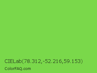 CIELab 78.312,-52.216,59.153 Color is a normal green color and the nearest color is Kiwi #8ee53f. Hex code #7ad84a and RGB value is rgb(122,216,74). In RGB color space, this color is composed of 48% red, 85% green, 29% blue, In CMYK color space, this color is composed of 44% cyan, 0% magenta, 66% yellow , 15% black , In HSL color space, this color has a hue angle of 100° , 65% saturation and 57% lightness.