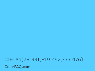 CIELab 78.331,-19.492,-33.476 Color is a light blue color and the nearest color is Maya Blue #73c2fb. Hex code #55cfff and RGB value is rgb(85,207,255). In RGB color space, this color is composed of 33% red, 81% green, 100% blue, In CMYK color space, this color is composed of 67% cyan, 19% magenta, 0% yellow , 0% black , In HSL color space, this color has a hue angle of 197° , 100% saturation and 67% lightness.