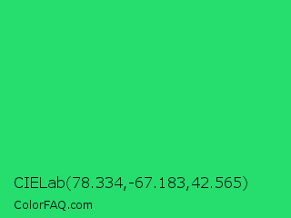 CIELab 78.334,-67.183,42.565 Color is a normal green color and the nearest color is UFO Green #3cd070. Hex code #26de6e and RGB value is rgb(38,222,110). In RGB color space, this color is composed of 15% red, 87% green, 43% blue, In CMYK color space, this color is composed of 83% cyan, 0% magenta, 50% yellow , 13% black , In HSL color space, this color has a hue angle of 143° , 74% saturation and 51% lightness.