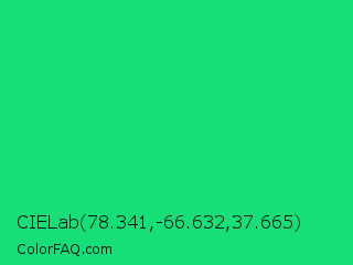 CIELab 78.341,-66.632,37.665 Color is a normal green color and the nearest color is UFO Green #3cd070. Hex code #18de78 and RGB value is rgb(24,222,120). In RGB color space, this color is composed of 9% red, 87% green, 47% blue, In CMYK color space, this color is composed of 89% cyan, 0% magenta, 46% yellow , 13% black , In HSL color space, this color has a hue angle of 149° , 80% saturation and 48% lightness.