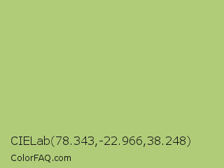CIELab 78.343,-22.966,38.248 Color is a light green color and the nearest color is Wild Willow #b9c46a. Hex code #b0cc79 and RGB value is rgb(176,204,121). In RGB color space, this color is composed of 69% red, 80% green, 47% blue, In CMYK color space, this color is composed of 14% cyan, 0% magenta, 41% yellow , 20% black , In HSL color space, this color has a hue angle of 80° , 45% saturation and 64% lightness.