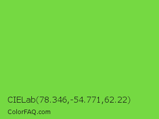 CIELab 78.346,-54.771,62.22 Color is a normal green color and the nearest color is Kiwi #8ee53f. Hex code #75d942 and RGB value is rgb(117,217,66). In RGB color space, this color is composed of 46% red, 85% green, 26% blue, In CMYK color space, this color is composed of 46% cyan, 0% magenta, 70% yellow , 15% black , In HSL color space, this color has a hue angle of 100° , 67% saturation and 55% lightness.