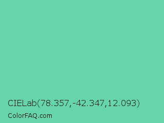 CIELab 78.357,-42.347,12.093 Color is a light green color and the nearest color is Medium Aquamarine #66ddaa. Hex code #66d6aa and RGB value is rgb(102,214,170). In RGB color space, this color is composed of 40% red, 84% green, 67% blue, In CMYK color space, this color is composed of 52% cyan, 0% magenta, 21% yellow , 16% black , In HSL color space, this color has a hue angle of 156° , 58% saturation and 62% lightness.