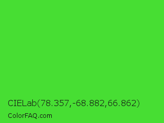 CIELab 78.357,-68.882,66.862 Color is a normal green color and the nearest color is Lime Green #32cd32. Hex code #47de33 and RGB value is rgb(71,222,51). In RGB color space, this color is composed of 28% red, 87% green, 20% blue, In CMYK color space, this color is composed of 68% cyan, 0% magenta, 77% yellow , 13% black , In HSL color space, this color has a hue angle of 113° , 72% saturation and 54% lightness.