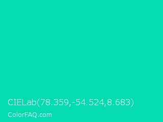CIELab 78.359,-54.524,8.683 Color is a normal cyan color and the nearest color is Amazonite #00c4b0. Hex code #04dbb0 and RGB value is rgb(4,219,176). In RGB color space, this color is composed of 2% red, 86% green, 69% blue, In CMYK color space, this color is composed of 98% cyan, 0% magenta, 20% yellow , 14% black , In HSL color space, this color has a hue angle of 168° , 96% saturation and 44% lightness.