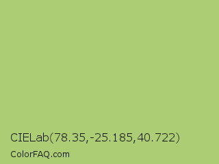 CIELab 78.35,-25.185,40.722 Color is a light green color and the nearest color is Wild Willow #b9c46a. Hex code #adcd74 and RGB value is rgb(173,205,116). In RGB color space, this color is composed of 68% red, 80% green, 45% blue, In CMYK color space, this color is composed of 16% cyan, 0% magenta, 43% yellow , 20% black , In HSL color space, this color has a hue angle of 82° , 47% saturation and 63% lightness.