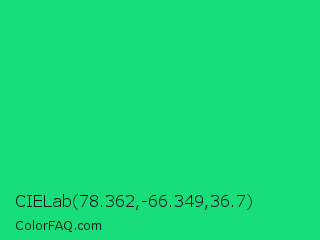 CIELab 78.362,-66.349,36.7 Color is a normal green color and the nearest color is Spring Green #00ff7f. Hex code #17de7a and RGB value is rgb(23,222,122). In RGB color space, this color is composed of 9% red, 87% green, 48% blue, In CMYK color space, this color is composed of 90% cyan, 0% magenta, 45% yellow , 13% black , In HSL color space, this color has a hue angle of 150° , 81% saturation and 48% lightness.