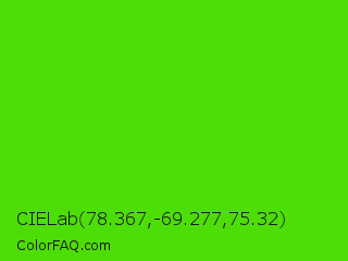 CIELab 78.367,-69.277,75.32 Color is a normal green color and the nearest color is Harlequin Green #46cb18. Hex code #4dde08 and RGB value is rgb(77,222,8). In RGB color space, this color is composed of 30% red, 87% green, 3% blue, In CMYK color space, this color is composed of 65% cyan, 0% magenta, 96% yellow , 13% black , In HSL color space, this color has a hue angle of 101° , 93% saturation and 45% lightness.
