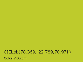 CIELab 78.369,-22.789,70.971 Color is a normal yellow color and the nearest color is Key Lime Pie #bfc921. Hex code #becb2c and RGB value is rgb(190,203,44). In RGB color space, this color is composed of 75% red, 80% green, 17% blue, In CMYK color space, this color is composed of 6% cyan, 0% magenta, 78% yellow , 20% black , In HSL color space, this color has a hue angle of 65° , 64% saturation and 48% lightness.