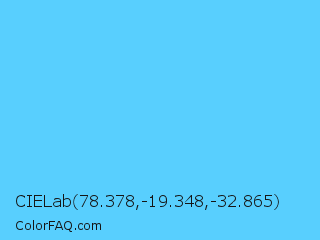 CIELab 78.378,-19.348,-32.865 Color is a light blue color and the nearest color is Maya Blue #73c2fb. Hex code #58cffe and RGB value is rgb(88,207,254). In RGB color space, this color is composed of 35% red, 81% green, 100% blue, In CMYK color space, this color is composed of 65% cyan, 19% magenta, 0% yellow , 0% black , In HSL color space, this color has a hue angle of 197° , 99% saturation and 67% lightness.