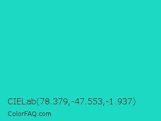 CIELab 78.379,-47.553,-1.937 Color is a normal cyan color and the nearest color is Turquoise PWG #30d5c8. Hex code #1cd9c4 and RGB value is rgb(28,217,196). In RGB color space, this color is composed of 11% red, 85% green, 77% blue, In CMYK color space, this color is composed of 87% cyan, 0% magenta, 10% yellow , 15% black , In HSL color space, this color has a hue angle of 173° , 77% saturation and 48% lightness.