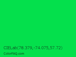 CIELab 78.379,-74.075,57.72 Color is a normal green color and the nearest color is Malachite #0bda51. Hex code #04e04c and RGB value is rgb(4,224,76). In RGB color space, this color is composed of 2% red, 88% green, 30% blue, In CMYK color space, this color is composed of 98% cyan, 0% magenta, 66% yellow , 12% black , In HSL color space, this color has a hue angle of 140° , 96% saturation and 45% lightness.