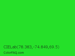 CIELab 78.383,-74.849,69.5 Color is a normal green color and the nearest color is Lime Green #32cd32. Hex code #25e029 and RGB value is rgb(37,224,41). In RGB color space, this color is composed of 15% red, 88% green, 16% blue, In CMYK color space, this color is composed of 83% cyan, 0% magenta, 82% yellow , 12% black , In HSL color space, this color has a hue angle of 121° , 75% saturation and 51% lightness.