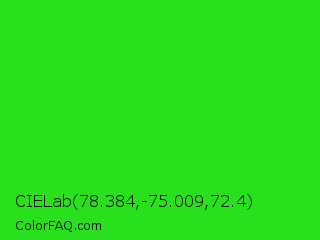 CIELab 78.384,-75.009,72.4 Color is a normal green color and the nearest color is Lime Green #32cd32. Hex code #29e01c and RGB value is rgb(41,224,28). In RGB color space, this color is composed of 16% red, 88% green, 11% blue, In CMYK color space, this color is composed of 82% cyan, 0% magenta, 88% yellow , 12% black , In HSL color space, this color has a hue angle of 116° , 78% saturation and 49% lightness.