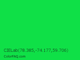CIELab 78.385,-74.177,59.706 Color is a normal green color and the nearest color is Malachite #0bda51. Hex code #0fe047 and RGB value is rgb(15,224,71). In RGB color space, this color is composed of 6% red, 88% green, 28% blue, In CMYK color space, this color is composed of 93% cyan, 0% magenta, 68% yellow , 12% black , In HSL color space, this color has a hue angle of 136° , 87% saturation and 47% lightness.