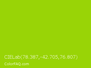 CIELab 78.387,-42.705,76.807 Color is a normal lime color and the nearest color is Sheen Green #8fd400. Hex code #99d406 and RGB value is rgb(153,212,6). In RGB color space, this color is composed of 60% red, 83% green, 2% blue, In CMYK color space, this color is composed of 28% cyan, 0% magenta, 97% yellow , 17% black , In HSL color space, this color has a hue angle of 77° , 94% saturation and 43% lightness.