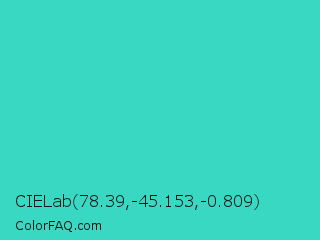 CIELab 78.39,-45.153,-0.809 Color is a normal cyan color and the nearest color is Turquoise PWG #30d5c8. Hex code #39d8c2 and RGB value is rgb(57,216,194). In RGB color space, this color is composed of 22% red, 85% green, 76% blue, In CMYK color space, this color is composed of 74% cyan, 0% magenta, 10% yellow , 15% black , In HSL color space, this color has a hue angle of 172° , 67% saturation and 54% lightness.