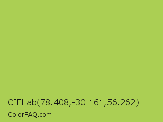 CIELab 78.408,-30.161,56.262 Color is a normal lime color and the nearest color is Conifer #acdd4d. Hex code #abcf53 and RGB value is rgb(171,207,83). In RGB color space, this color is composed of 67% red, 81% green, 33% blue, In CMYK color space, this color is composed of 17% cyan, 0% magenta, 60% yellow , 19% black , In HSL color space, this color has a hue angle of 77° , 56% saturation and 57% lightness.