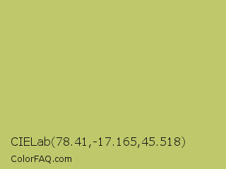 CIELab 78.41,-17.165,45.518 Color is a normal yellow color and the nearest color is Wild Willow #b9c46a. Hex code #bfc96b and RGB value is rgb(191,201,107). In RGB color space, this color is composed of 75% red, 79% green, 42% blue, In CMYK color space, this color is composed of 5% cyan, 0% magenta, 47% yellow , 21% black , In HSL color space, this color has a hue angle of 66° , 47% saturation and 60% lightness.