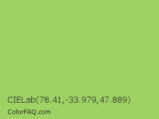 CIELab 78.41,-33.979,47.889 Color is a light green color and the nearest color is Pistachio #93c572. Hex code #9fd165 and RGB value is rgb(159,209,101). In RGB color space, this color is composed of 62% red, 82% green, 40% blue, In CMYK color space, this color is composed of 24% cyan, 0% magenta, 52% yellow , 18% black , In HSL color space, this color has a hue angle of 88° , 54% saturation and 61% lightness.