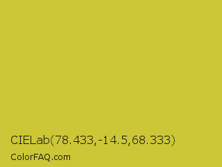 CIELab 78.433,-14.5,68.333 Color is a normal yellow color and the nearest color is Earls Green #c9b93b. Hex code #ccc736 and RGB value is rgb(204,199,54). In RGB color space, this color is composed of 80% red, 78% green, 21% blue, In CMYK color space, this color is composed of 0% cyan, 2% magenta, 74% yellow , 20% black , In HSL color space, this color has a hue angle of 58° , 60% saturation and 51% lightness.